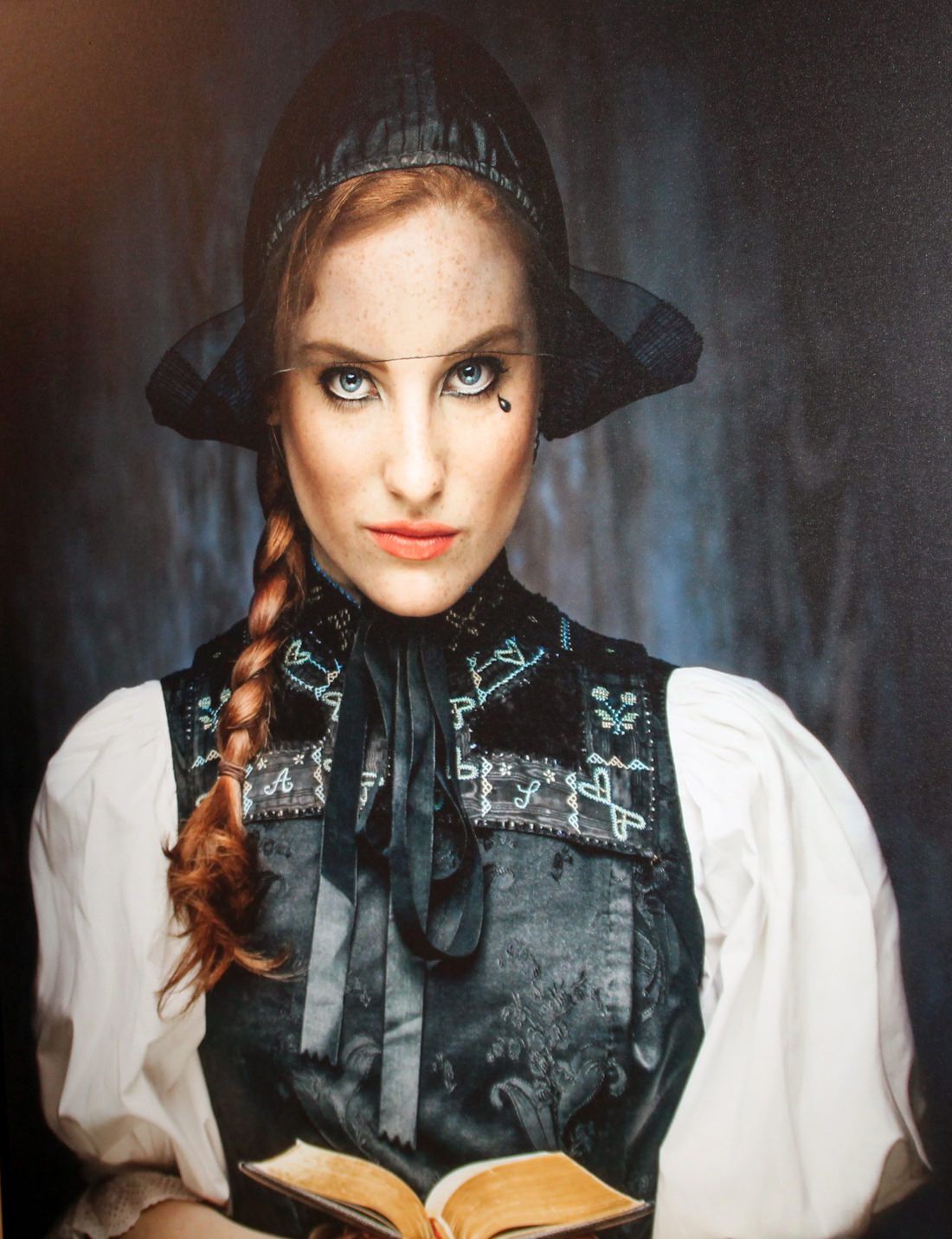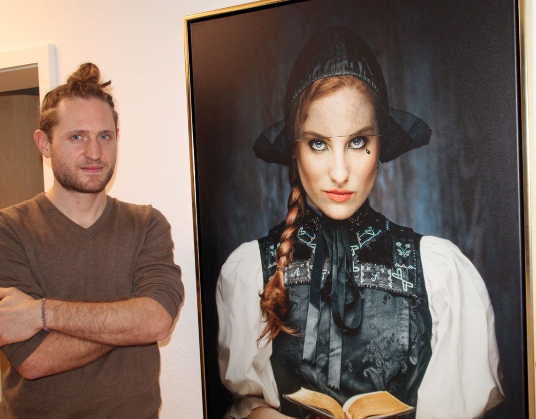 Wie es sich manchmal so ergibt, kam Sebastian Wehrle mit „Kosmos Schwarzwald“ und Uwe Baumann in Kontakt. Hier gab es in Lahr eine Ausstellung als Chance für Youngsters bei anderen Künstlern. Und hier kommt dann auch die „Freiämter Hornkappe mit Riesenschleife“ ins Spiel. Wehrle engagierte die mutige Visagistin Ramona, begeisterte Sina als Modell und so entstand der Anfang zu seinen unglaublichen Trachten-Bildern. Sicher ist sich Wehrle, dass er mit seiner Fotografie den Schwarzwald belebt hat, ich stimme ihm zu und denke, er hat ihn modernisiert, in den Fokus gerückt, auch provokant am angestaubten Schwarzwaldidyll geschabt und gekratzt. Dennoch ist sich Wehrle seiner Verantwortung sicher. Alle seine Motive stecken in einer Original-Tracht mit geschichtlichem Hintergrund. Da finden sich das Schäppel aus Simonswald, oder der Iltishut aus Kehl/Hanau, der Bollenhut aus Kirnbach, der Rollenkranz aus Mühlenbach oder der Strohzylinder aus Schönwald und viele, viele mehr.