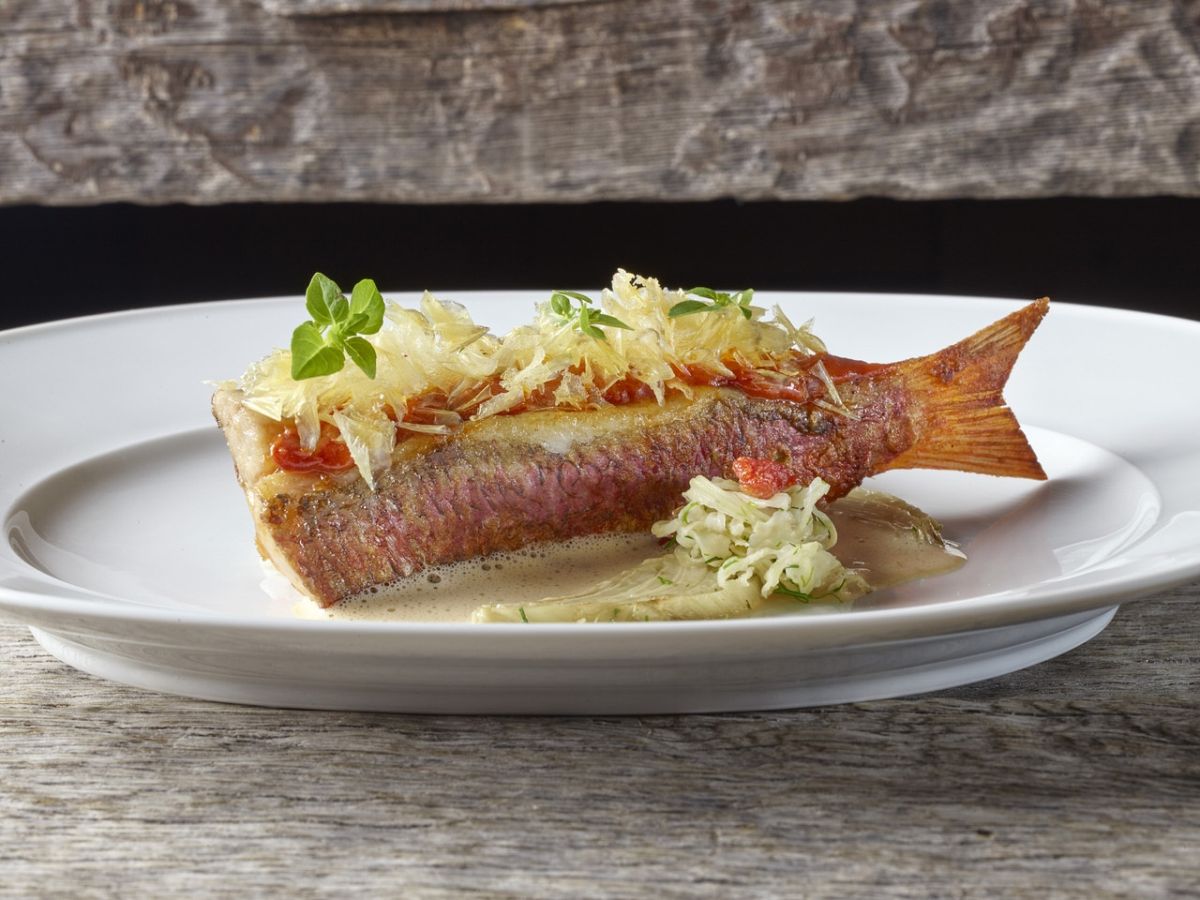 Schwarzwaldstube: Gefüllte Rotbarbe mit milden Knoblauchschuppen, Gewürztomaten und Fenchel, leichter Paprikasud mit altem Sherryessig