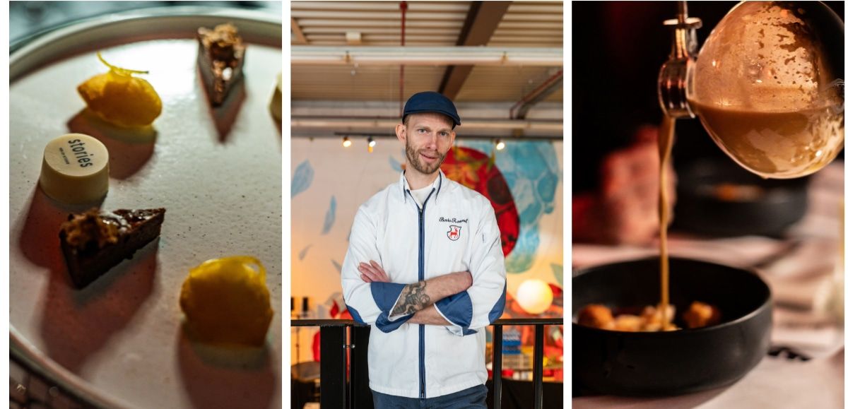 Wie schon für die letzten Kapitel hat Wolfram Glatz vom Atelier glatz & glatz die Idee ausgearbeitet und in Szene gesetzt: „Diesmal holen wir Urbanität in die Provinz. Sieben Städte in deren Lebensgefühl der Gast eintaucht. Mal leise, mal energetisch und laut, mal dunkel, mal hell und bunt.“ Während der Reise wechseln die Gäste die Räume, für die Kulisse sorgen die jeweils meterhohen Wandgemälde internationaler Künstler. Doch wie Glatz betont, geht es im Stories nicht um Show: „Vielmehr unterstreicht die Inszenierung nur die Kunst auf dem Teller.“ Und für die wiederum sorgt in diesem Jahr zusammen mit Sven Günther von der Bliss Group auch 2- Sternekoch Boris Rommel: „Für mich ist das Pop-up eine ganz neue Erfahrung. Ich finde die Idee spannend, in einer Lagerhalle Streetart-Kunst sonst Küchenchef im Wald & Schlosshotel Friedrichsruhe ist. Das 5-Gänge-Plus-Menü trägt in vielen Gängen seine Handschrift. Doch Rommel, der in seinem Sterne-Restaurant Le Cerf vornehmlich klassisch-französisch kocht, konnte auch seiner Liebe zu Thailand mit einem Gang frönen. So verschmelzen Kunst, Inszenierung, Interieur und Kulinarik stimmig miteinander. Dabei spielt das Team die Themen auch gerne humorvoll aus: Bei einem kurzen Abstecher von Bangkok nach Mexiko City zum Beispiel darf als Zwischengang