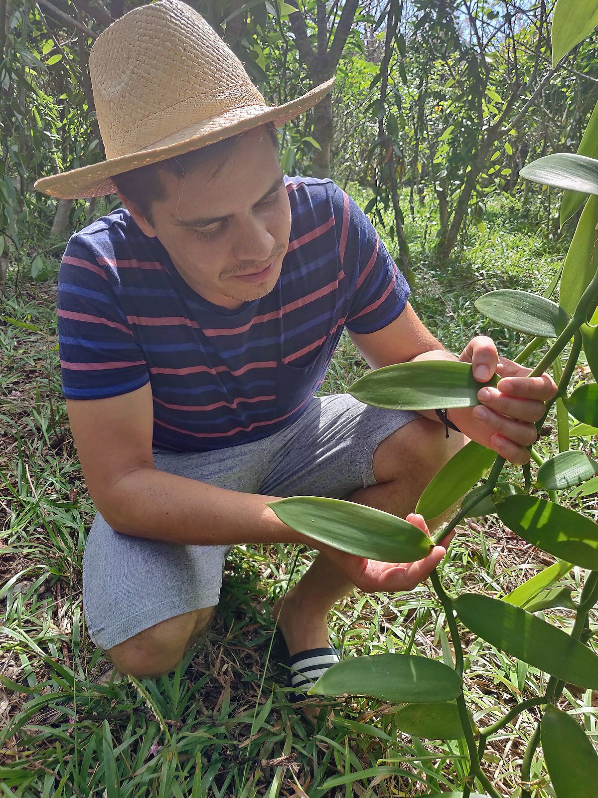 Da die Vanille eine Kletterpflanze ist, wird sie in Körperhöhe abgeschnitten, um so die Bestäubung von Hand durchführen zu können. Neun Monate später gibt es dann die Schoten. Die Schote brauche viel Zeit an der Pflanze, so klärt Andréa auf, aber je länger sie dort hängt, desto schneller werden auch Diebe auf den Plan gerufen, die die exklusiven Bourbon-Vanilleschoten dann auf dem Schwarzmarkt für gutes Geld verkaufen. Übrigens, wer das auch nicht wusste, die Vanille wächst im Waldstück, braucht Sonne, aber keine direkte Sonneneinstrahlung. Dann wird die grüne Schote verarbeitet, dabei ergeben am Ende sechs Kilogramm grüne Schoten nur ein Kilogramm schwarze Schoten. Stefan Wissert schwärmt: „Alles riecht nach Vanille, wenn auf jeder Fläche die Schoten getrocknet werden.“