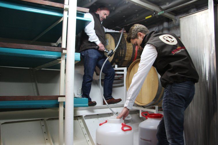 Martin und Christian Steinhauser (von links nach rechts) beim Einpumpen des neuen Whiskys in die Fässer.