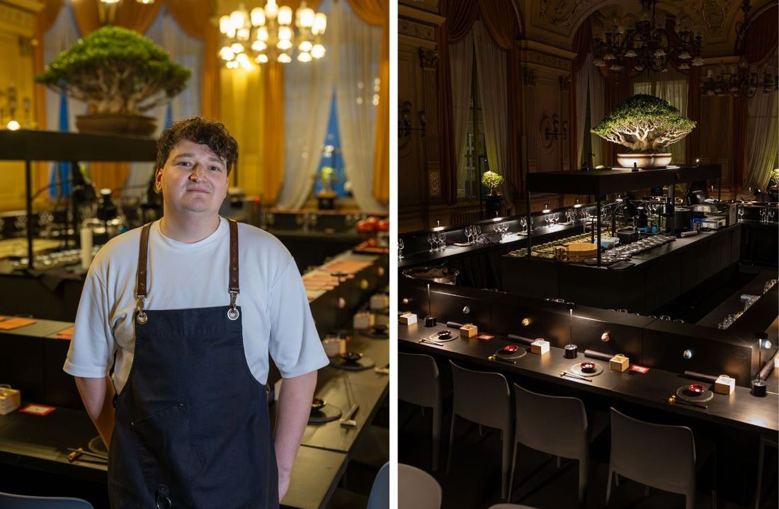 Doch hinter dem traditionellen Noren, jenem Stoffvorhang, der beim Durchschreiten symbolisch den Schritt von der Straße in die geschützte Welt des Hauses markiert, beginnt jedoch ein ganz anderes Erlebnis. Im Gastraum könnte der Kontrast kaum größer sein: Der historische Spiegelsaal empfängt die Gäste mit klarer, reduzierter Ästhetik. In angenehm gedämpftem Licht entsteht so eine ruhige, beinahe intime Atmosphäre. Hier ist das Refugium von 2-Sternekoch und GaultMillau „Koch des Jahres 2025“ Benjamin Peifer. Inmitten von angestrahlten Bonsai-Bäumchen an schwarzen Tischen präsentiert der 38-Jährige eine Essenz seine regional beeinflusste und modern interpretierte japanische Kochkunst. Das 5-Gänge-Menü mit zusätzlichem Zwischengang steht unter dem Motto „Omakase“ für all das, was Peiffer auch in seinem eigenen Restaurant Intense in Wachenheim entwickelt hat: eine Küche, die Pfälzer Produkte mit japanischer Präzision und Texturverliebtheit verbindet. Im Stories kommen seine Teller ohne große Effekte aus, weil es um die Konzentration auf die Produkte und die Aromen geht. Jeder Gang besticht durch seinen komplexen Geschmack, seine feinen Rauchnoten, sein Säurespiel und seine Umami-Tiefe. Der Abend startet beispielsweise mit Kingfisch aus Völklingen als „Okonomiyaki“, gefolgt von klassischer Ramensuppe und danach japanischem Rind mit Perigord-Trüffel, Ponzu und schwarzem Knoblauch. Dazu kommt eine Getränkebegleitung, die zwischen großartigen Weinen deutscher Winzer, Sake und alkoholfreien Pairings pendelt und die Aromatik der Gerichte pointiert weitererzählt. So wird der Abend im Stories zu einer komprimierten, sehr persönlichen Lesart seiner Intense-Küche in einem für das Stories typischen, ungewöhnlichen Setting.