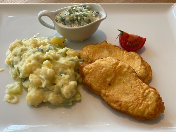 Kabeljau in der Teighülle gebacken mit Salatgurkensalsa und Kartoffel-Gurkensalat