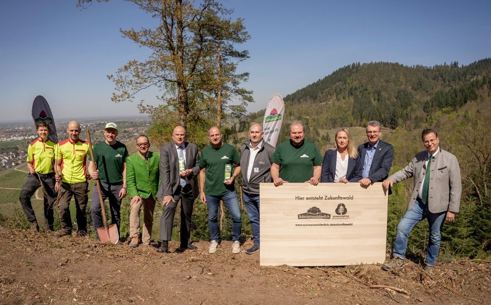 v.l.n.r.: - Anne Teufel, Forstwirt-Auszubildene - Manuel Braun, Forstwirtschaftsmeister - Moritz Collmar, Leitung PR/Marketing/Business Development Schwarzwaldmilch - Roland Burger, Präsident Forstkammer Baden-Württemberg - Dr. Ulrich Theileis, Präsident Baden-Württembergischer Genossenschaftsverband - Andreas Schneider, Geschäftsführer Schwarzwaldmilch - Kurt Weber, Geschäftsführer Waldservice Ortenau und Mitglied Arbeitskreis Klimapositive Waldwirtschaft - Markus Kaiser, Aufsichtsratsvorsitzender Schwarzwaldmilch - Amalia Lindt-Herrmann, Bürgermeisterin der Gemeinde Ortenberg - Thorsten Erny, Landrat des Ortenaukreises - Peter Hauk MdL, Minister für Ernährung, Ländlichen Raum und Verbraucherschutz Baden-Württemberg
