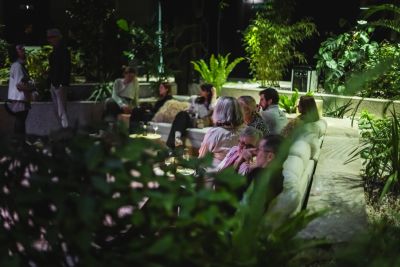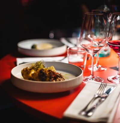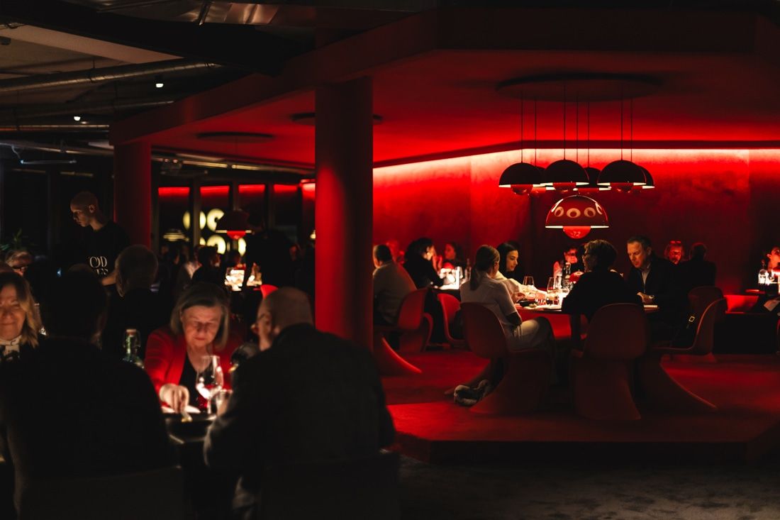 Doch vor dem Menü durften sich die Gäste erstmal vom Design der Location überraschen lassen. Schon das Atrium des verwaisten Bürogebäudes, in dem der Restaurantbesuch startet, hat sich komplett verändert: Aus dem ehemaligen Empfangsbereich mit achteckiger Glaskuppel ist ein Entree mit Bar und gemütlichem Lounge-Bereich inmitten von Pflanzen geworden. Doch noch größer war die Reaktion der Gäste beim Betreten des Restaurantbereichs, der ganz im Retrostil der 70er- und 80er Jahre im kräftigen Rot gehalten ist. „Unfassbar, das sieht alles so toll aus“, sagt zum Beispiel Marion Kinzig. Ebenso begeistert zeigt sich Uschi Kidane, die seit Jahrzehnten für den Springer Nature Verlag tätig ist und die meiste Zeit in diesem Bürogebäude arbeitete: „Das eigenwillige Gebäude samt seiner Kantine erstrahlt in komplett neuem Glanz. Nicht nur mir gefällt‘s ausgesprochen gut: auch unseren früheren Eigentümern samt ihrem Freund Andy Warhol hätte die Event-Location im Pop-Art-Stil zugesagt. Ein neues Kapitel für das alte Gebäude ist aufgeschlagen.“