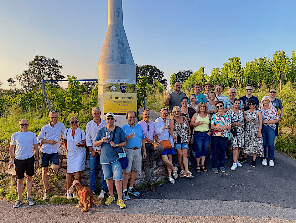 Das traditionelle Gruppenfoto bei der Weinflasche in den Rammersweieren Reben bei der "Zukunft ins Glas“