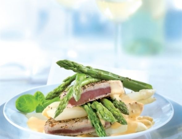Zutaten für 4 Personen: • 4 Thunfischfilets à 150 g • 300 g geschälter weißer Spargel • 300 g geputzter grüner Spargel • 1 Scheibe von…