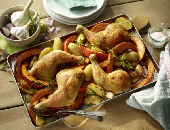 Rezept der Woche - Ofenhähnchen mit Kürbisspalten