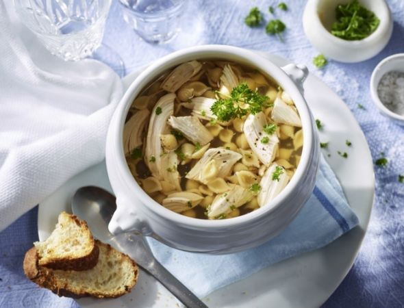 Zutaten Für 4 Personen: 1 ganzes Hähnchen, 3 L Wasser, Salz, Pfeffer, 2 Lorbeerblätter, 1 TL schwarze Pfefferkörner, 1 Zwiebel, 1 Paket Suppengemüse (Sellerie, Porree, Möhren…