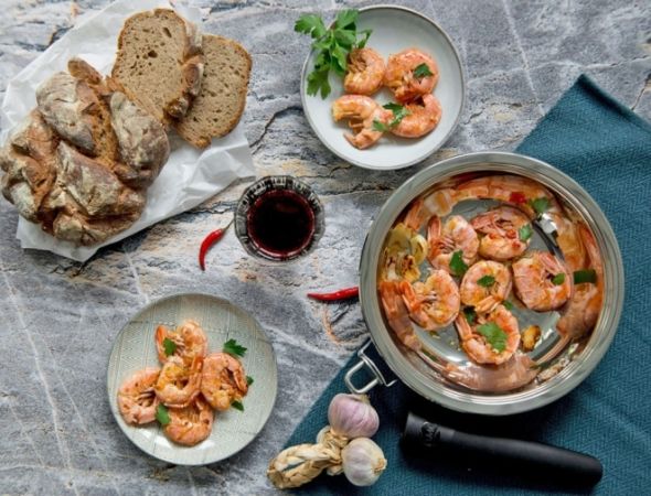 Zutaten: 300 g rohe ungeschälte Garnelen, 2 Knoblauchzehen, 1 rote Chilischote, 5 EL Olivenöl, 1 Prise edelsüßes Paprikapulver, Weinessig, Salz