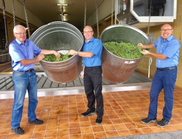 Hauptsächlich aus der Frühsorte Solaris, die für den Federweißer optimal geeignet ist. „Selten so früh, aber dieses Jahr ist es so“, sind sich die Vorstände Dr. Peter Schuster und Eckart Escher mit Qualitätsma…