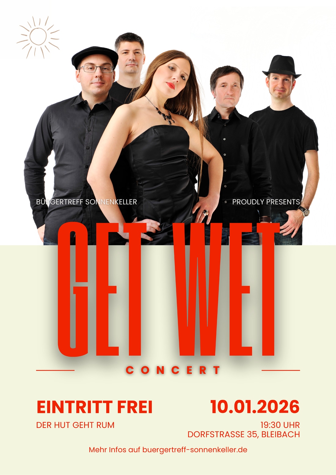 Am 10. Januar 2026, wird die bekannte Cover-Band GetWet aus dem Elztal mit einem Neujahrskonzert im Sonnenkeller Bleibach auftreten 😍🔥