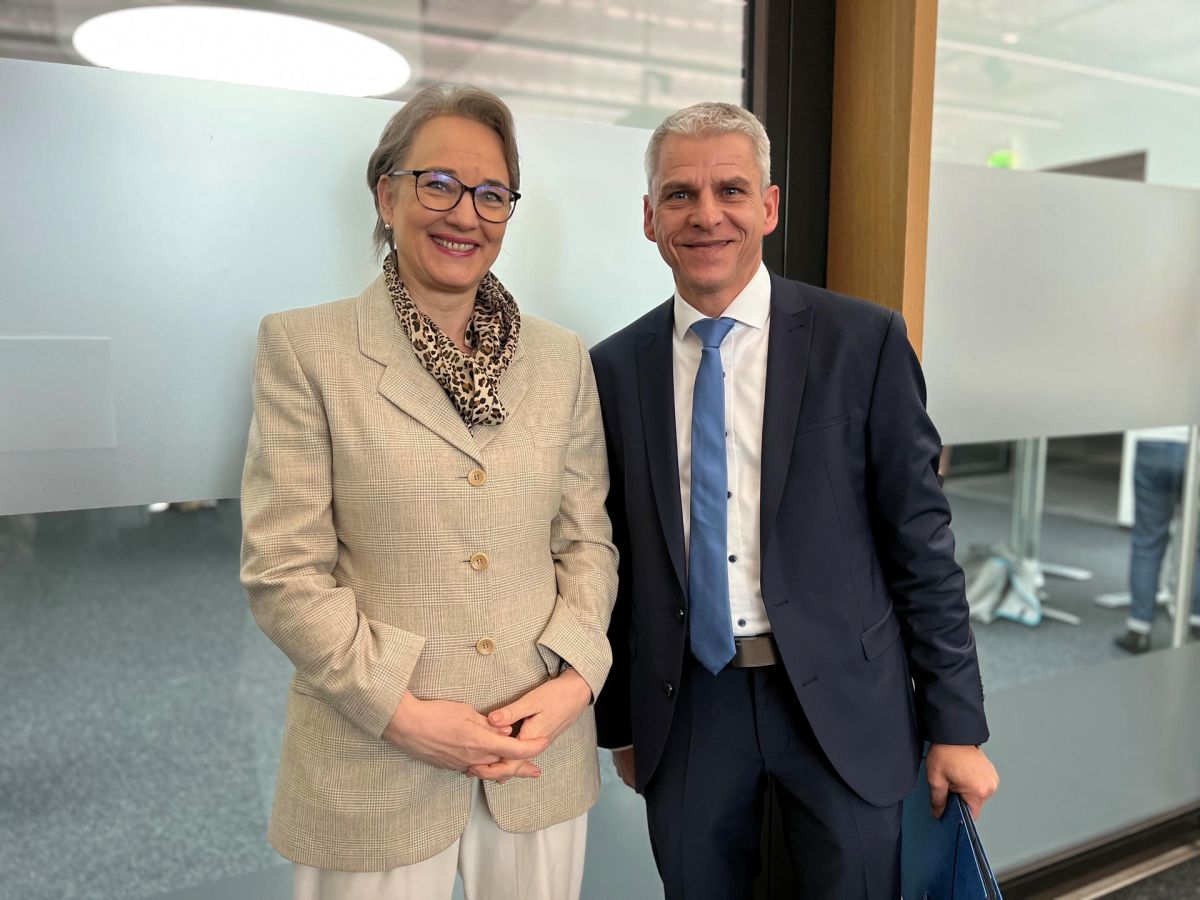Sichtlich zufrieden zeigen sich auf der CMT Tanja Traub, Hauptgeschäftsführerin der im Baden-Württembergischen Industrie- und Handelskammertag (BWIHK) und Staatssekretär Dr. Patrick Rapp