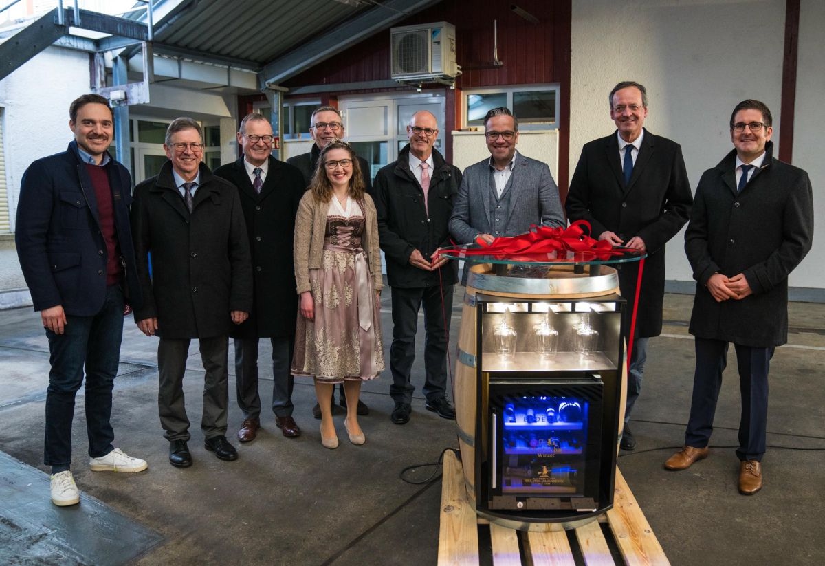 Ein Weinfass mit Kühlfunktion war das Geschenk der Oberkircher Winzer v.l. die Oberkircher Weinprinzessin Katharina Bruder, Aufsichtsratsvorsitzender Herbert Vollmer, Dr. Sebastian Hill, Vorstandsvorsitzender Franz Männle und Markus Ell. Abschiedsfeier v.l. Dr. Sebastian Hill, Herbert Vollmer, Dr. Roman Glaser, Markus Volk von Weinland Baden, Weinprinzessin Katharina Bruder, Vorstandsvorsitzender Franz Männle, Markus Ell, OB Matthias Braun, Bürgermeister Stefan Hattenbach.