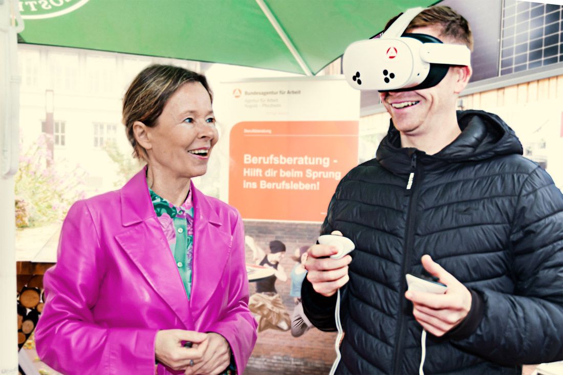 Eine Virtual-Reality-Brille, die den Sprung in mehr als100 Berufe ermöglicht. Das war die Kulisse für den Aktionstag „Berufsberatung To Go“ am Dienstag, 23. September 2025.
