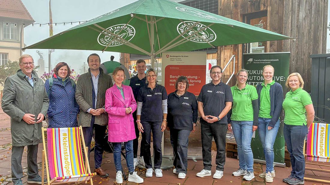 Das Aktionstag-Team mit (von links): WFG-Geschäftsführer Jochen Protzer, Wirtschaftsbeauftragte Elke Latscha und Oberbügermeister Adrian Sonder sowie Martina Lehmann, Chefin der Agentur Arbeit Nagold-Pforzheim. Außerdem im Bild: Nico Schüler, Susanne Franzke, Waltraud Barton, Ayhan Kamil (alle Arbeitsagentur) und Kerstin Weipert, Svea Taube und Lidia Niestoruk (alle TraFoNetz). für