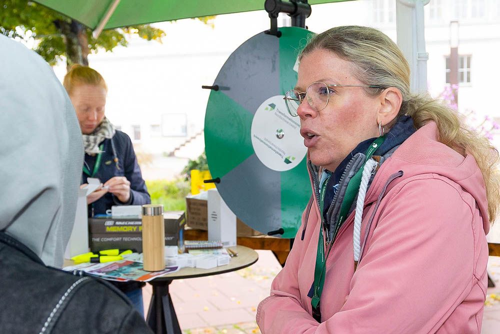Kerstin Weipert vom TraFoNetz-Team informiert am Glücksrad über Weiterbildung und berufliche Qualifikation