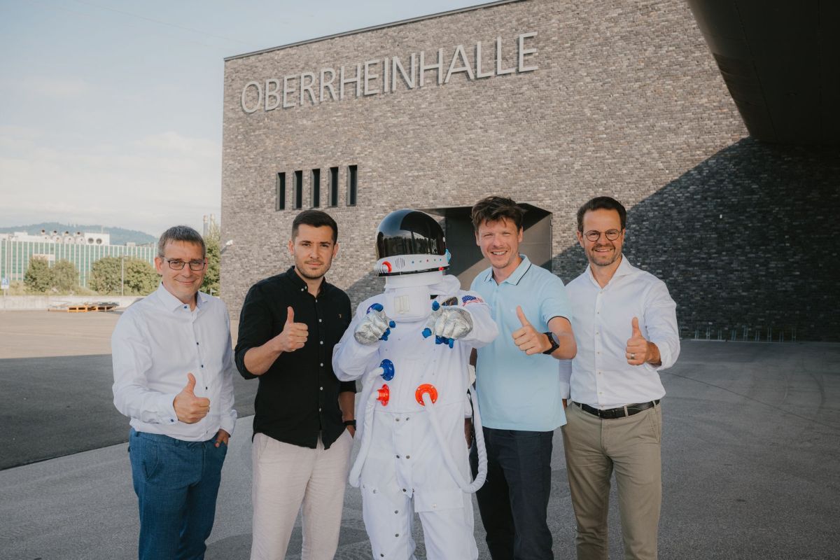 von links: Frank Thieme, Geschäftsführer der Messe Offenburg/Ortenau, David Ghassemi, Initiator und Veranstalter der BLACKFORESTSPACE, das Maskottchen der BLACKFORESTSPACE, Florian Appel, Geschäftsführer der Black Forest Innovation GmbH, Marco Steffens, Oberbürgermeister von Offenburg