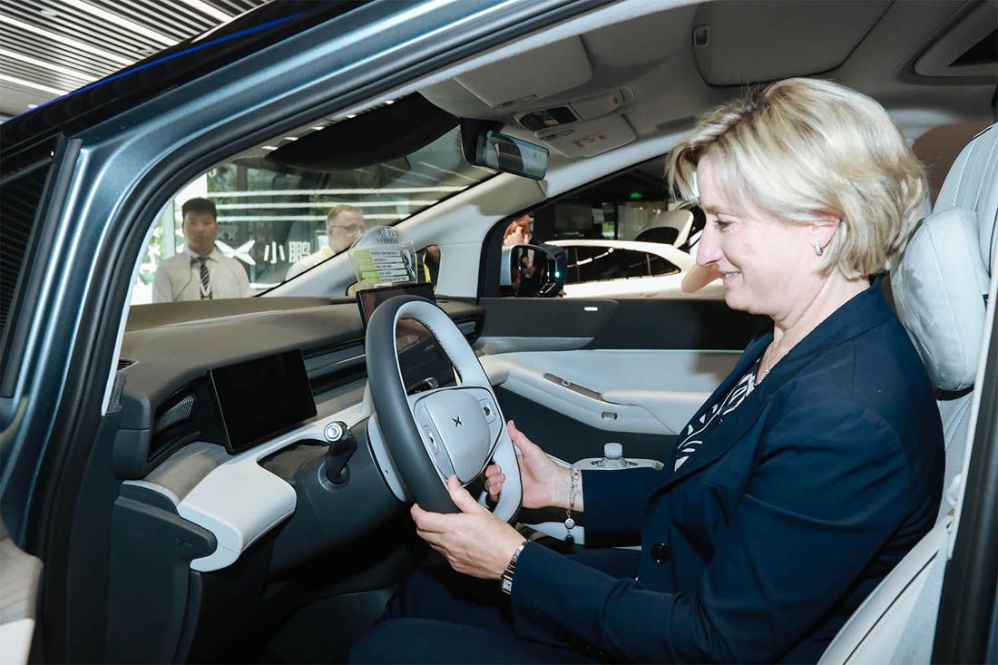 Die baden-württembergische Wirtschaftsministerin Dr. Nicole Hoffmeister-Kraut in einem Xiaomi-Fahrzeug, das von dem chinesischen Smartphone-Zulieferer in nur wenigen Jahren entwickelt wurde.