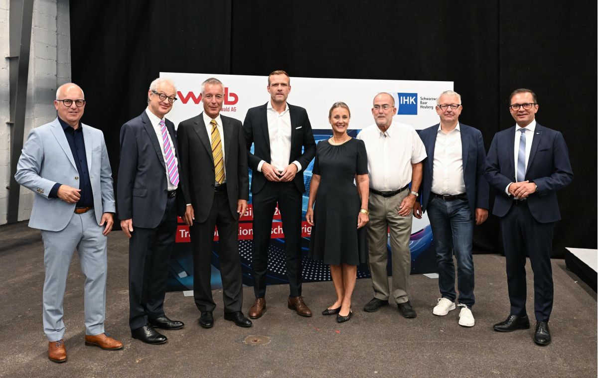 Eröffnung des Automotive-Gipfels in Donaueschingen. Von links: Thomas Burger (Präsident wvib Schwarzwald AG und Geschäftsführender Gesellschafter Burger Group), Dr. Harald Marquardt (Vorsitzender des Vorstands der Marquardt-Gruppe aus Rietheim-Weilheim und IHKVizepräsident), Moderator Andreas Richter, Keynote-Speaker Dr. Martin Koers, IHK-Präsidentin Birgit Hakenjos, Keynote-Speaker Tim Cole, Dr. Christoph Münzer (Hauptgeschäftsführer wvib Schwarzwald AG) und Thomas Albiez (Hauptgeschäftsführer IHK Schwarzwald-Baar-Heuberg)