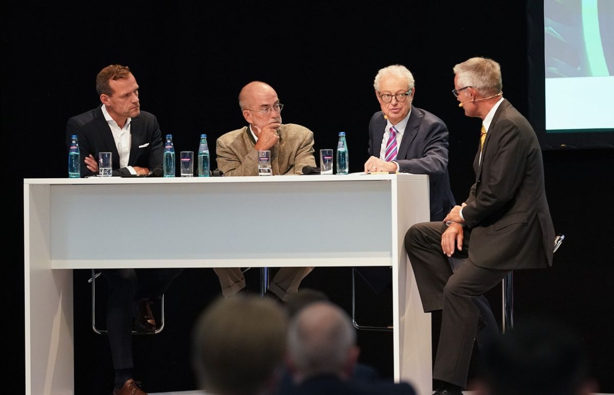 Podiumsdiskussion zur Zukunft der Mobilität. Von links: KeynoteSpeaker Dr. Martin Koers, Keynote-Speaker Tim Cole, Dr. Harald Marquardt (Vorsitzender des Vorstands der Marquardt-Gruppe aus Rietheim-Weilheim und IHK-Vizepräsident) und Moderator Andreas Richter
