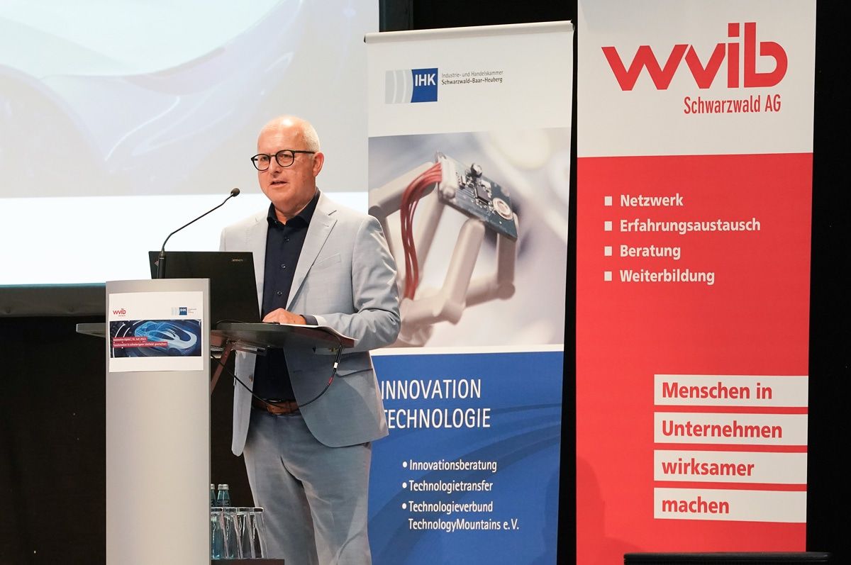 wvib-Präsident Thomas Burger fand in seiner Begrüßung deutliche Worte: „Noch nie war die Welt der Automobilindustrie so in Aufruhr wie heute“. Der Schonacher Unternehmer, selbst Automobilzulieferer, prangerte das Gebaren der Markenhersteller in der Krise an. Firmen wie Mercedes und VW machen in der Krise Kasse – und drangsalieren die Zulieferer, unter anderem indem sie Kosten in die Lieferkette weitergeben, gleichzeitig aber kaum Preissteigerungen akzeptieren. An das Plenum appellierte Burger: „So wie jetzt kann es nicht weitergehen.“ Birgit Hakenjos, Präsidentin der IHK Schwarzwald-Baar-Heuberg, betonte in Ihrer Begrüßung dagegen die langfristigen Aussichten und gab sich kämpferisch: „Wir wollen diesen Wandel aktiv mitgestalten – die Voraussetzungen für eine erfolgreiche Transformation sind hier vor Ort gegeben.“ Hakenjos betonte die strukturell guten Standortfaktoren der Region, merkte aber zugleich auch an, dass die anstehenden Aufgaben keine kleinen sind.