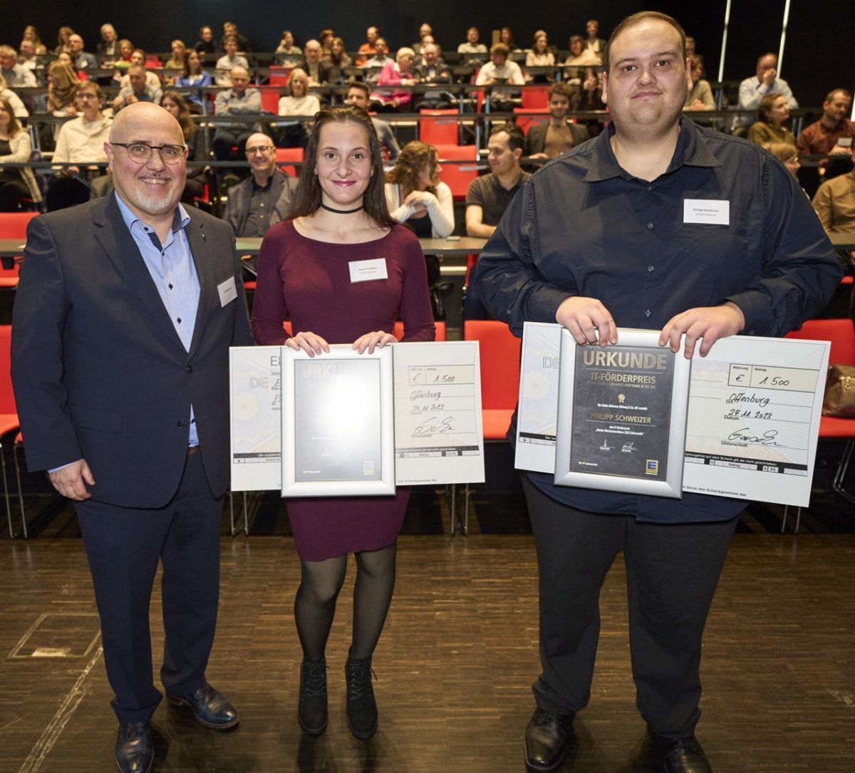 Philipp Schweizer erhielt die Auszeichnung für den besten Masterabschluss 2023 im Studiengang Informatik und Anne Trampert für den besten Bachelorabschluss 2023 im Studiengang Wirtschaftsinformatik. „Wir freuen uns sehr, die zwei besten Abschlüsse mit dem IT-Förderpreis zu würdigen. Die beiden Absolventen haben große Eigeninitiative gezeigt und lösungsorientierte Ansätze erarbeitet, die auch im Berufsleben von Bedeutung sind“, sagte Karl Prappacher bei der Übergabe. Im Rahmen der jährlichen Preisverleihung überreichen verschiedene Unternehmen, Vereine und Institutionen aus der Ortenau Förderpreise an Studierende der Hochschule Offenburg, die sich durch ihre herausragenden akademischen Leistungen oder ihr außergewöhnliches Engagement hervorgetan hatten.