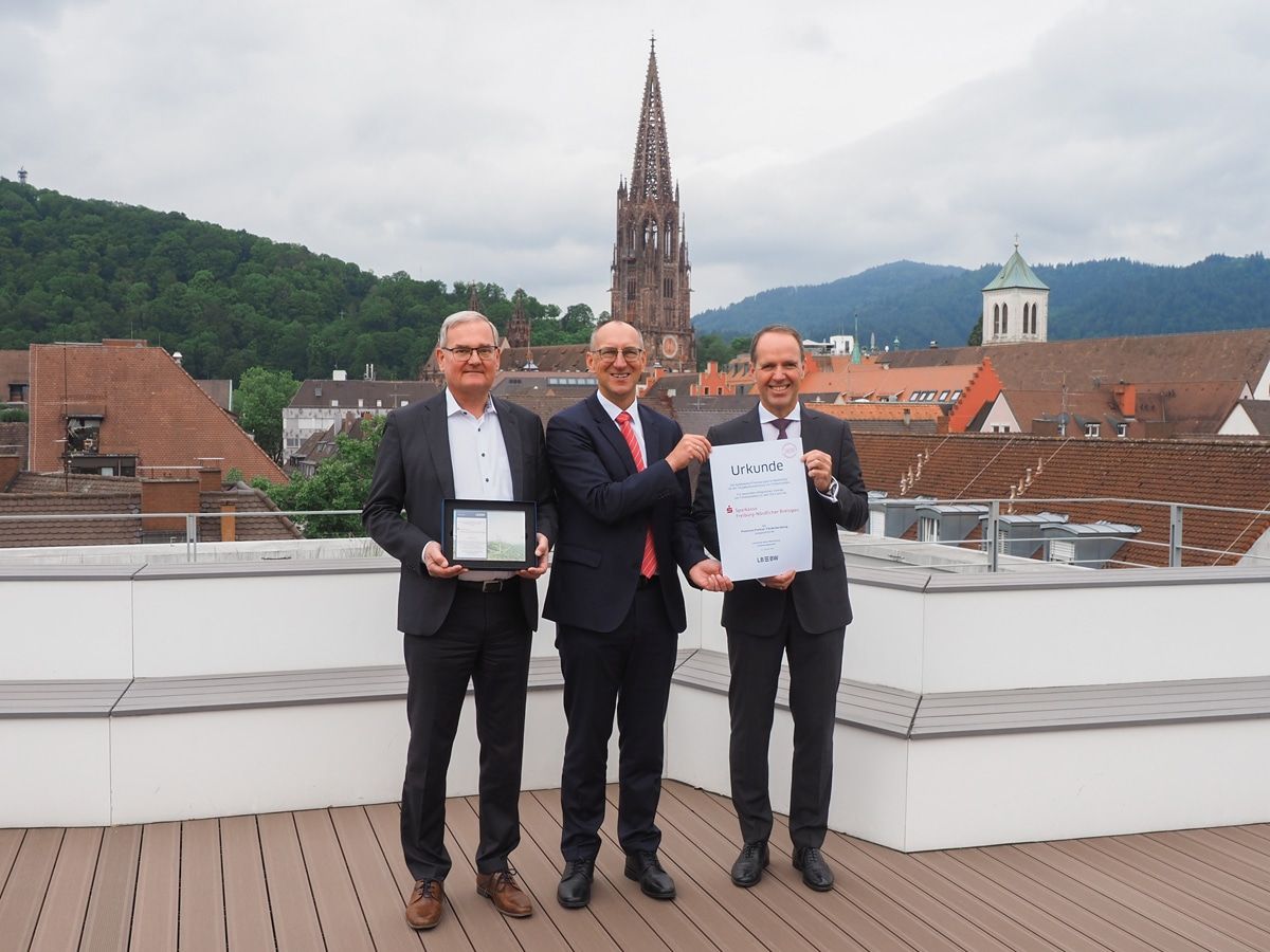 (v.l.n.r.): Ausgezeichnet! Klaus-Dieter Sauer, Spezialist für Förderfinanzierungen der Sparkasse Freiburg-Nördlicher Breisgau, erhält von Frank Wenz, Direktor Förderkreditgeschäft der LBBW, gemeinsam mit Markus Hildmann, Leiter des Bereichs Firmenkunden-Corporate Finance der Sparkasse Freiburg-Nördlicher Breisgau, die Urkunde überreicht.