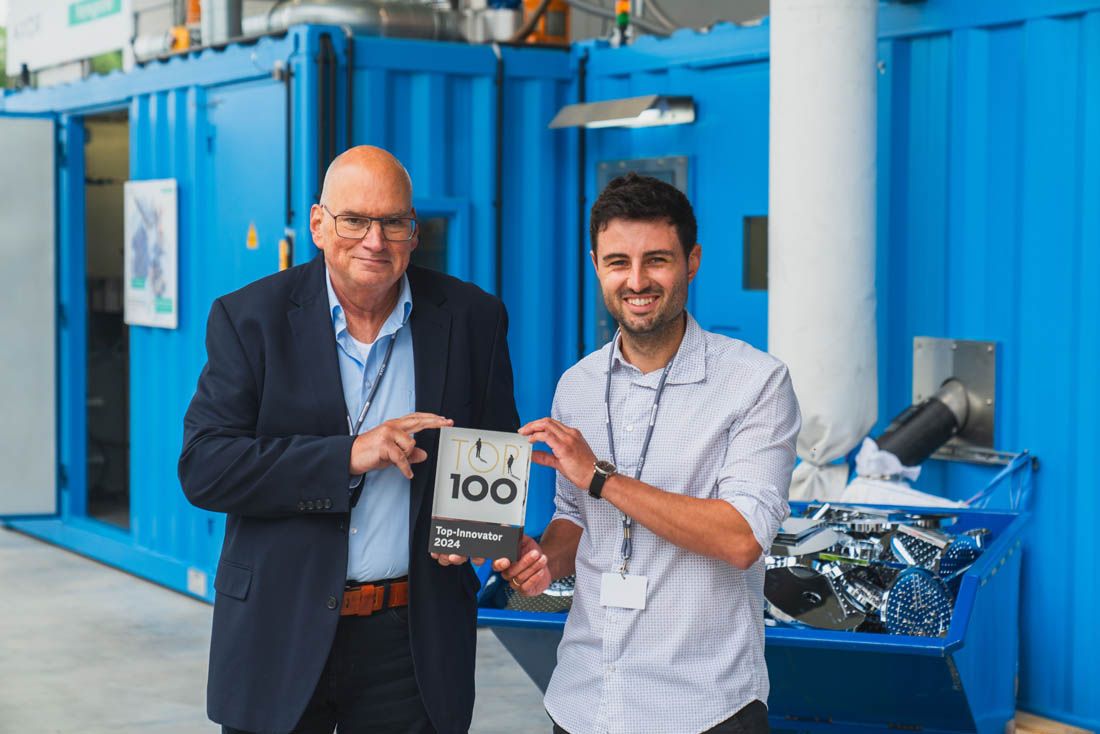 Die Hansgrohe Group gehört zum siebten Mal in Folge zu den Top-Innovatoren des deutschen Mittelstands. Thorsten Pohl (l.), Vice President Technical Engineering & Technology Hansgrohe SE, und David Zapf, Spezialist Surface Technology Hansgrohe SE, sind stolz auf die Auszeichnung mit dem TOP 100 Siegel.