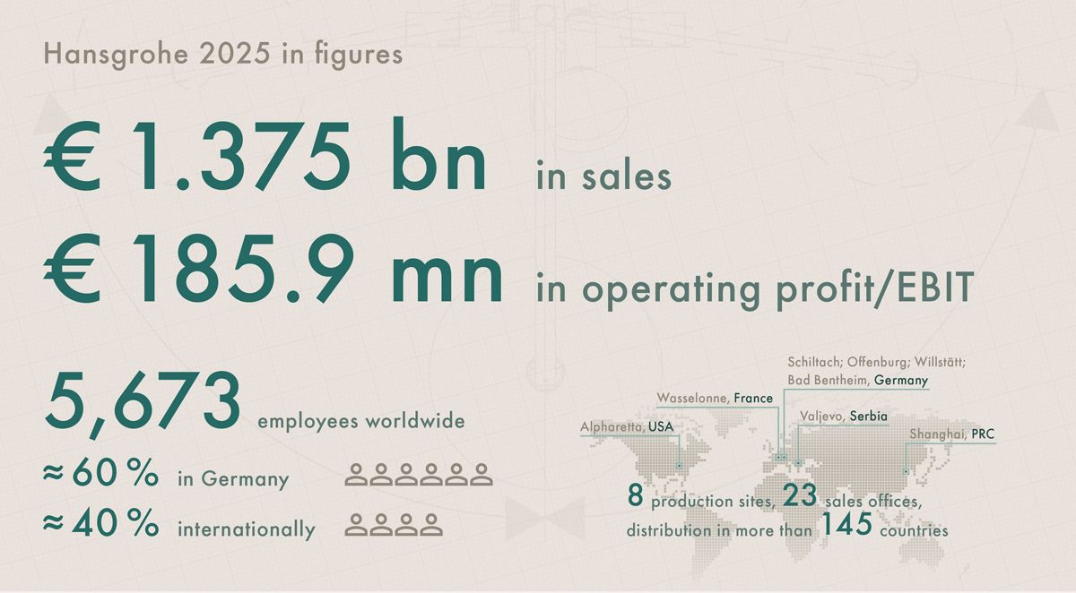 „Der Umsatz war zufriedenstellend“, sagt der Hansgrohe CEO, „wir verzeichnen jedoch ein leichtes Minus.“ Als einer der führenden Hersteller von Design- und Premiumprodukten für Bad und Küche erzielte das Unternehmen aus Schiltach/Baden-Württemberg im abgelaufenen Jahr einen Gesamtumsatz von 1,375 Milliarden Euro. Dies entspricht im Vergleich zum Vorjahr (2024: 1,387 Milliarden Euro) einem Rückgang von 0,9 Prozent. Währungsbereinigt weist der Umsatz ein leichtes Plus von 0,9 Prozent gegenüber dem Vorjahr auf. Das Betriebsergebnis lag mit 185,9 Millionen Euro 7 Prozent unter dem Vorjahreswert (2024: 199,9 Millionen Euro). Die Umsatz-Ergebnisquote sank auf 13,5 Prozent (2024: 14,4 Prozent). Das EBITDA blieb mit 243,6 Millionen Euro 5,1 Prozent unter dem Vorjahr (2024: 256,6 Millionen Euro). Die daraus resultierende EBITDA-Marge verringerte sich auf 17,7 Prozent (2024: 18,5 Prozent).