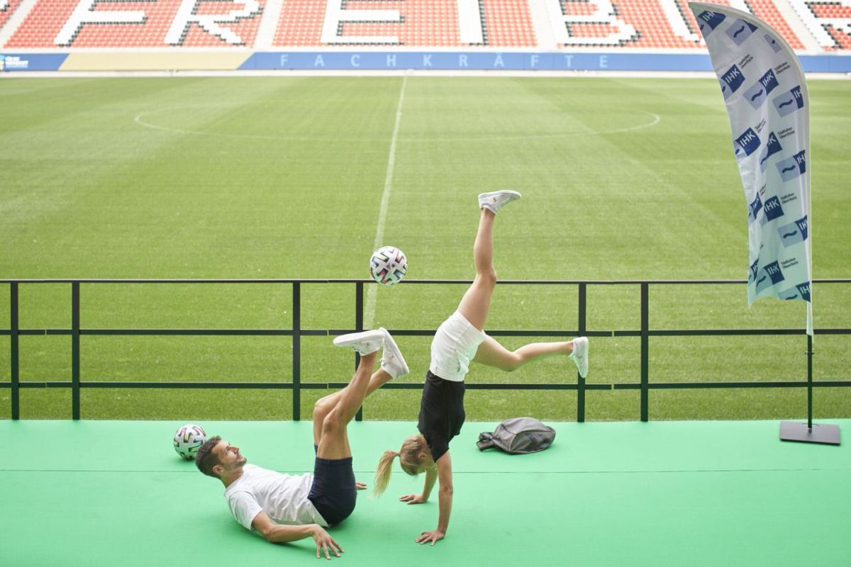 An einem heißen Sommertag begrüßte die IHK Südlicher Oberrhein bei ihrem Großevent, dem IHK-Heimspiel, rund 900 Gäste auf der Westtribühne des Europa-Park-Stadions in Freiburg. Inmitten der modernen Architektur erwartete die Teilnehmer:innen auf einer Bühne vor dem grünen Rasen eine spektakuläre Fußball-Show von zwei Weltmeistern im Fußball-Freestyle: Aguśka und Patrick von AP Freestyle zeigten in einem Mix aus Fußballtricks, Tanz und Akrobatik zu moderner Popmusik, wie sich ein Fußball mit fast jedem Körperteil jonglieren lässt. Bei einem Handstand gleichzeitig den Ball auf einem Bein jonglieren? Für die Supertalente kein Problem.