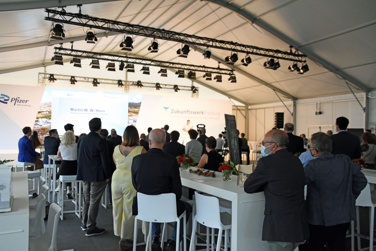 Oberbürgermeister Martin Horn erläuterte, welche Bedeutung die Gesundheitswirtschaft für die Stadt Freiburg hat. So generieren die Unternehmen dieses Wirtschaftsbereichs rund 28 Prozent des Gewerbesteueraufkommens und sind mit rund 35.000 Beschäftigten zugleich die mit Abstand größte Wirtschaftsbranche in der Stadt. Martin Horn betonte dabei: „Pfizer ist mit aktuell über 1.800 Mitarbeitenden ein beeindruckender Jobmotor in ganz Südbaden. Der Neubau der automatischen High-Containment-Fabrik ist ein klares Bekenntnis von Pfizer zur Zukunfts- und Wettbewerbsfähigkeit des Freiburger Standorts im internationalen Wettbewerb. Hier in Freiburg werden Medikamente „Made in Germany“ für den Weltmarkt produziert. Es freut mich daher besonders, dass wir diese Woche die offizielle Eröffnung dieser hochmodernen und hocheffizienten "Fabrik in der Fabrik" gefeiert haben.“