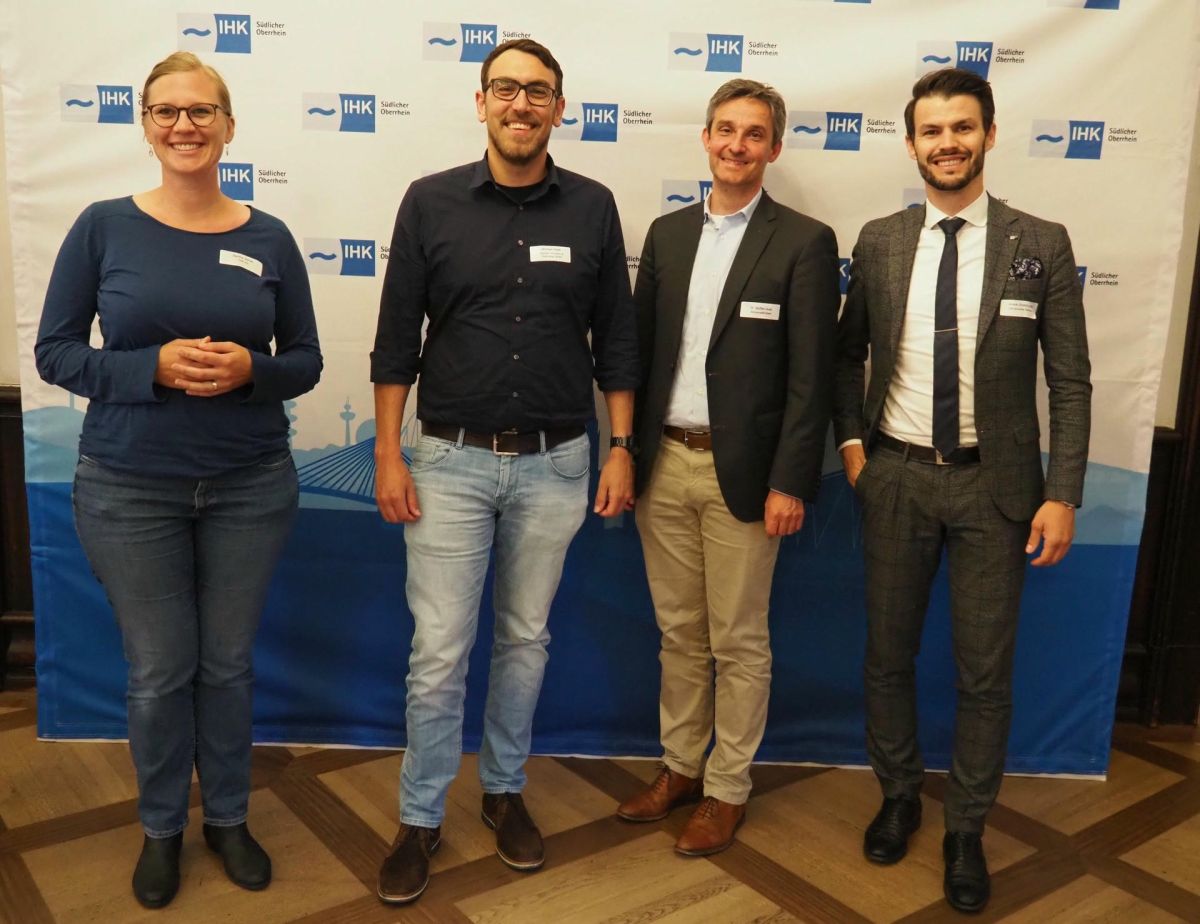 Unternehmer:innen präsentierten ihre Nachhaltigkeitsstrategien (v.l.): Santha Zeiher von FSM, Michael Maier von Koehler Innovation & Technology, Dr. Steffen Auer von Schwarzwaldeisen mit André Olveira-Lenz, Leiter des Geschäftsbereichs Innovation und Umwelt bei der IHK Südlicher Oberrhein