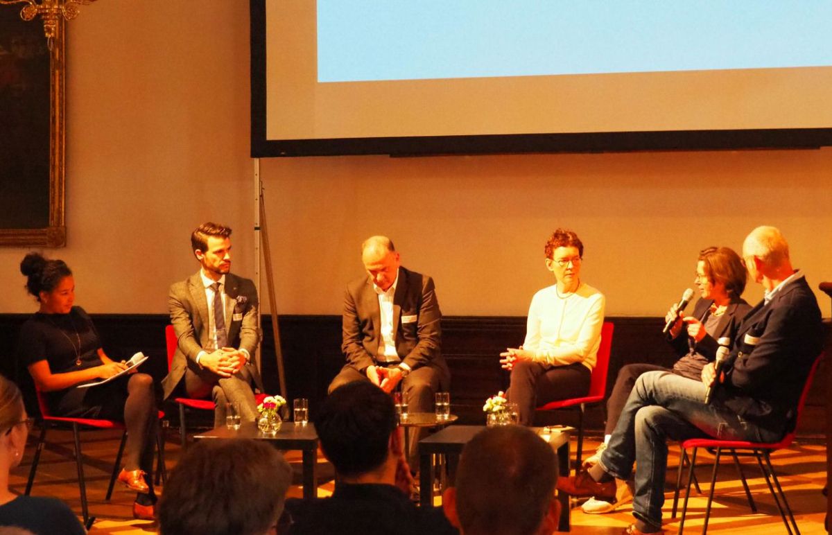 Bei der Podiumsdiskussion (v.l.) Jil Munga, André Olveira-Lenz, beide IHK SO, Prof. Dr. Mario Schmidt, Birte Hackenjos, CEO der Haufe group, Gesa Schöneberg, Leiterin Forschung und Beratung der Stiftung Allianz, Dirk Kron, Projektleiter für den „Green Industry Park Freiburg“.