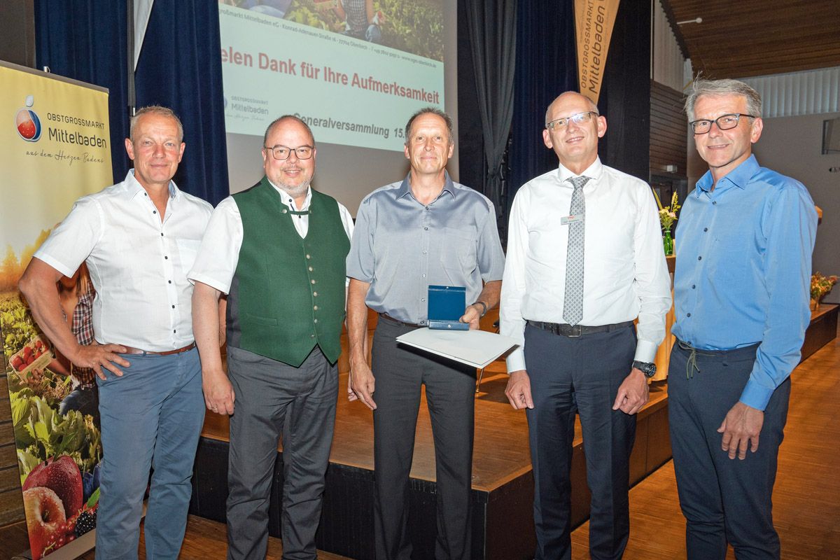 Für sein Engagement im Vorstand der OGM wurde Franz Kurz vom Baden-Württembergischen Genossenschaftsverband geehrt. Unser Foto zeigt v.l. Ausichtsratsvorsitzender Markus Grimmig, Geschäftsführender Vorstand Ulrich Dahm, Franz Kurz, Verbandsprüfer Olaf Stockmann und Vorstandsvorsitzenden Martin Bähr.