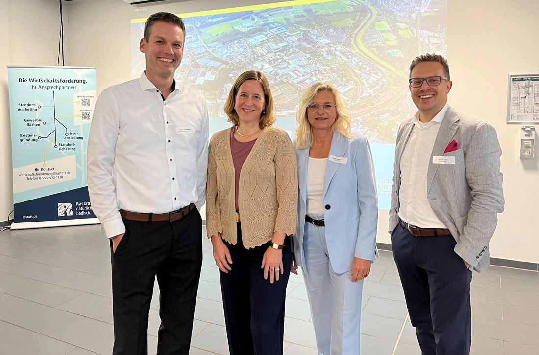 Oberbürgermeisterin Monika Müller (Zweite von links) mit den Referenten Björn Vahlenkamp (links), Sabine Schmucker und Nicolas Dürr beim Wirtschaftstreffen 2025.