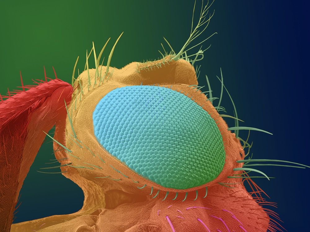Die Erstellung dieses Bildes, das aus mehr als 30 Ebenen gerendert wurde, nahm etwa 50 bis 60 Stunden in Anspruch. Nun sind die etwa 800 einzelnen Einheiten, aus denen das Auge der Fruchtfliege besteht und die als Ommatidien bezeichnet werden, gut zu erkennen. Diese anatomische Struktur verleiht der Fruchtfliege ein weites Panorama-Sichtfeld und außergewöhnliche Fähigkeiten zur Bewegungserkennung. Dadurch kann Drosophila Bewegungen mit extrem hoher zeitlicher Auflösung wahrnehmen und praktisch in Zeitlupe mit einer Geschwindigkeit von bis zu 250 Bildern pro Sekunde „sehen”.