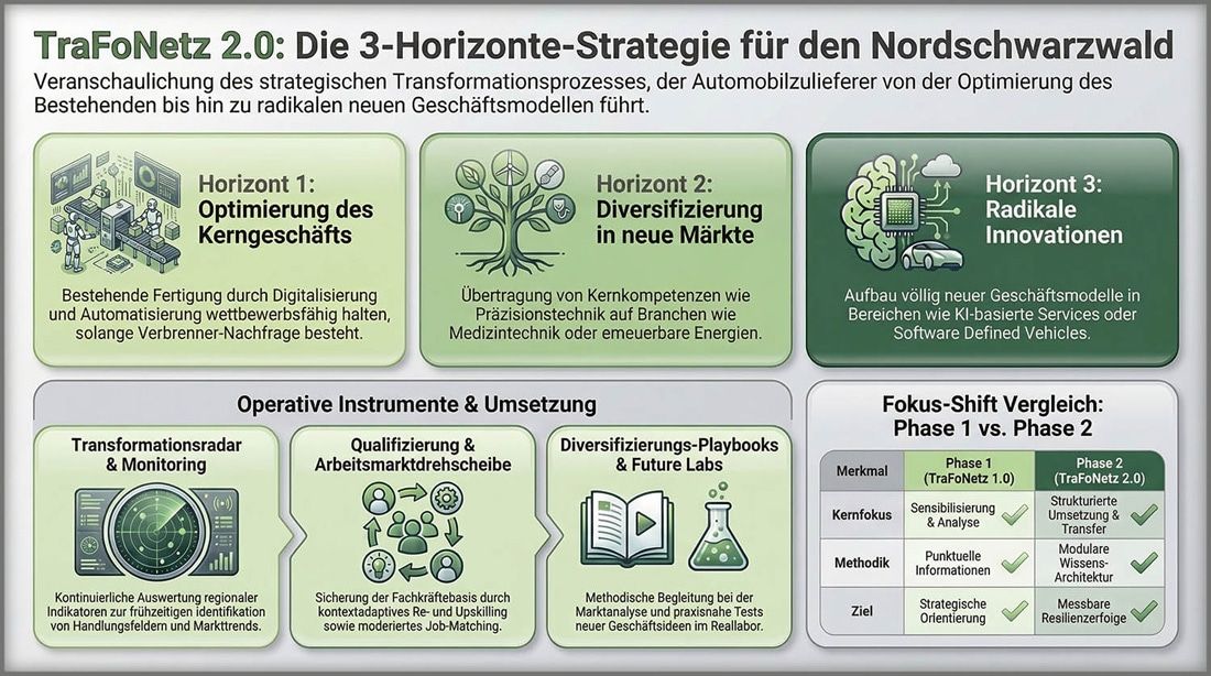 Das Konzept hinter TraFoNetz 2.0 folge einem sogenannten 3-Horizonte-Ansatz, erläutert Professor Dr. Bernhard Kölmel von der Hochschule Pforzheim. Im ersten Horizont gehe es darum, das laufende Kerngeschäft durch Digitalisierung und Automatisierung wettbewerbsfähig zu halten. Im zweiten Horizont würden Unternehmen dabei unterstützt, ihre Kernkompetenzen, etwa in der Präzisionsbearbeitung oder im Sondermaschinenbau, auf neue Branchen wie Medizintechnik, Energietechnik oder die Sicherheitsindustrie zu übertragen. Der dritte Horizont ziele auf radikale Innovation: neue Geschäftsmodelle im Bereich software-definierter Fahrzeuge, KI-basierter Dienste oder datengetriebener Mobilität.