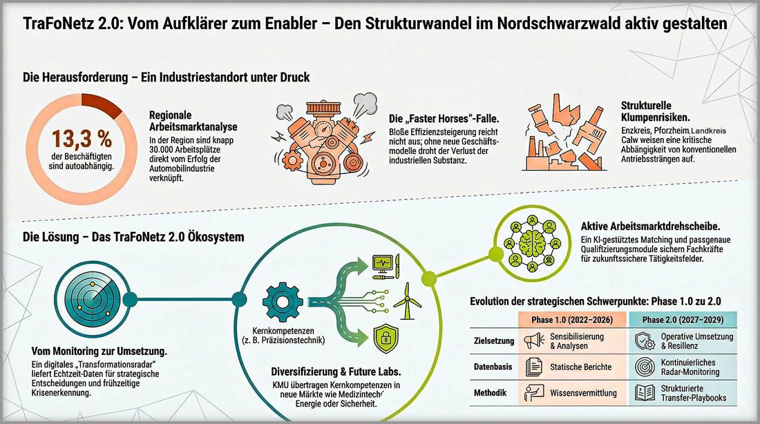 Für die Region geht es laut Protzer um weit mehr als ein Förderprojekt. Es gehe um Perspektiven für Betriebe, Beschäftigte und die wirtschaftliche Zukunft des Nordschwarzwalds mit rund 620.000 Menschen in den Landkreisen Enzkreis, Calw, Freudenstadt und dem Stadtkreis Pforzheim. Das industrielle Rückgrat des Nordschwarzwalds stehe unter massivem Druck: Knapp mehr als 13 Prozent aller Beschäftigten in der Region, rund 30.000 Menschen, hängen Protzer zufolge direkt oder indirekt von der darbenden Automobilwirtschaft ab. Angesichts einer Kurzarbeiterquote, die fast dreimal so hoch ist wie der baden-württembergische Durchschnitt und einer besorgniserregenden Insolvenzentwicklung setzen die regionalen Akteure nun auf die Karte „TraFoNetz 2.0“.