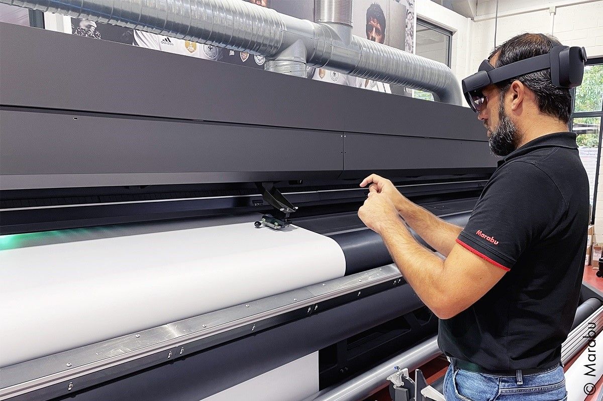 Ob für Motive auf Flaschen und Gläsern, Armaturenkomponenten in Fahrzeugen oder die Markierungen der Waschgänge auf Waschmaschinen – Marabu hat für eine Vielzahl an Materialien die passende Farbe. Seinen Kunden bietet das Unternehmen aus Tamm in Baden-Württemberg dabei ein Rundumpaket: Von der Beratung für die passenden Farben bis hin zum Vor-Ort-Service, falls industrielle Druckmaschinen ausfallen. Um diesen Service künftig so ressourcenschonend wie möglich anzubieten, nutzt Marabu Mixed Reality: Mit HoloLens 2 sowie Dynamics 365 spart das Unternehmen CO2, Reisezeit und -kosten ein.