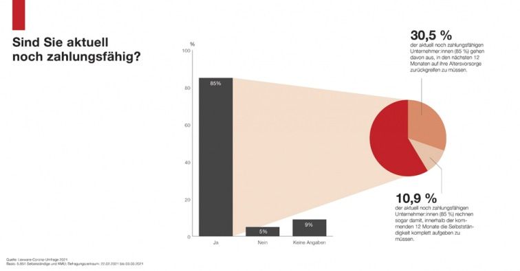 Das wirtschaftliche Resultat nach einem Jahr mit Corona? Auf den ersten Blick überraschend positiv: Rund 85 Prozent (84,9 %) der befragten Unternehmer:innen sind trotz Umsatzeinbußen aktuell noch zahlungsfähig. Das ergab eine aktuelle Lexware-Umfrage[1] unter 5.651 Selbstständigen im März 2021. Nicht allerdings ohne dabei auf private finanzielle Rücklagen zurückzugreifen. 30,5 Prozent der aktuell noch zahlungsfähigen Selbstständigen gehen davon aus, in den nächsten 12 Monaten auf die für ihre Altersvorsorge vorgesehenen Ersparnisse zurückgreifen zu müssen. Rund jeder Neunte (10,9 %) rechnet sogar damit, binnen eines Jahres die Selbstständigkeit komplett aufgeben zu müssen. Junge Unternehmen trifft es dabei besonders hart: Über die Hälfte der Selbstständigen (56,4 %), deren Existenzgründung nach 2018 erfolgte, mussten privat finanzielle Einbußen erleiden.