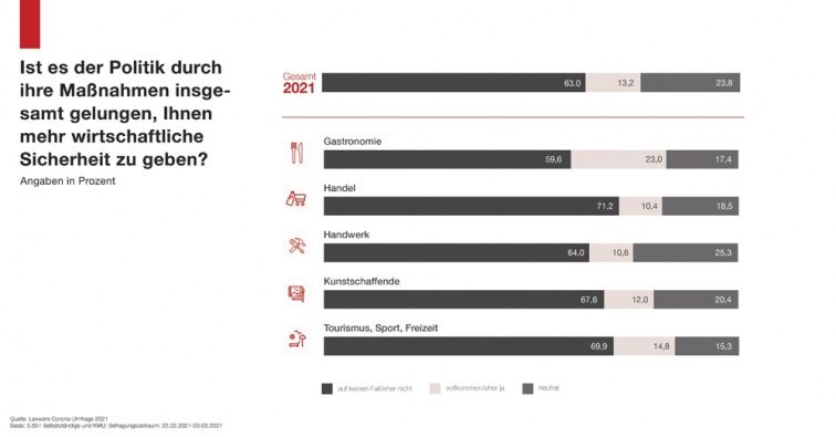 Damit kommen nach einem Jahr Corona-Pandemie rund 2 von 3 Befragte (63 %) zu dem Ergebnis, dass es der Politik weitestgehend nicht gelungen sei, mit ihren Maßnahmen wirtschaftliche Sicherheit zu vermitteln. In einer vergleichbaren Befragung[3] während des ersten Lockdowns im April 2020 sagte das jede:r zweite (51,3 %) Selbstständige. Somit ist der Anteil binnen eines Jahres um rund 24 Prozent gestiegen. Nur eine:r von acht Selbstständigen (13,2 %) ist hingegen der Meinung, die Vermittlung wirtschaftlicher Sicherheit sei der Politik „eher schon“ oder „vollkommen“ gelungen – 2020 waren dieser Überzeugung noch 25,8 Prozent und somit knapp doppelt so viele.