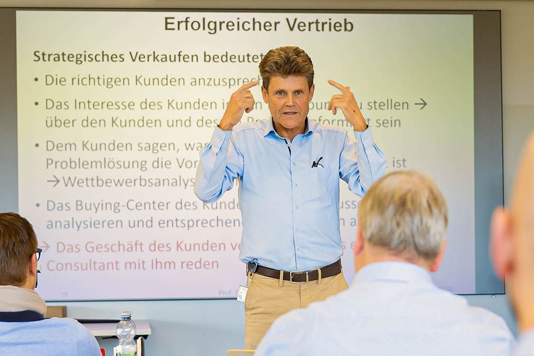 Dr.-Ing. Reiner Bührer, Professor an der Hochschule Pforzheim, machte deutlich: Es gehe „um Menschen, nicht um Maschinen“. Er warnte vor der „Technokratenfalle": Wer im Vertriebsgespräch mögliche technische Umsetzungsprobleme bei der Auftragserledigung ins Gespräch bringe, habe es schwer. Der Vertriebler benötige dann zehn gute Botschaften, um eine negative Botschaft wieder aus dem Kopf des Kunden zu bekommen.