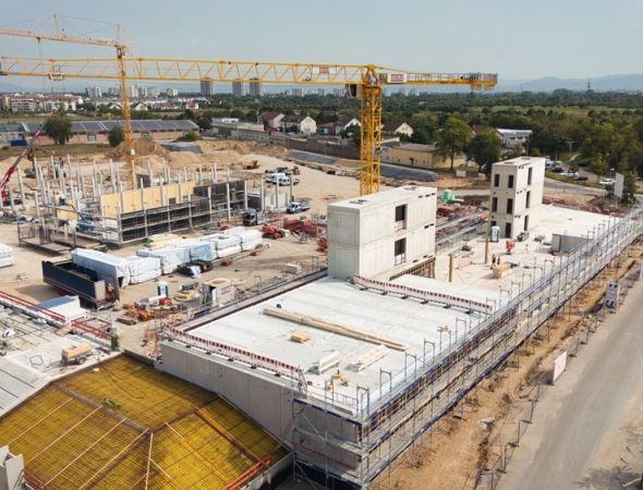 Mannheim/Stuttgart, 26.8.2025: Die Holzbauarbeiten für den Grünen Betriebshof Mannheim haben begonnen. Im Auftrag der GBG Sonderimmobilien GmbH errichtet die Ed. Züblin AG auf einem rund 30.000 m² großen Grund…