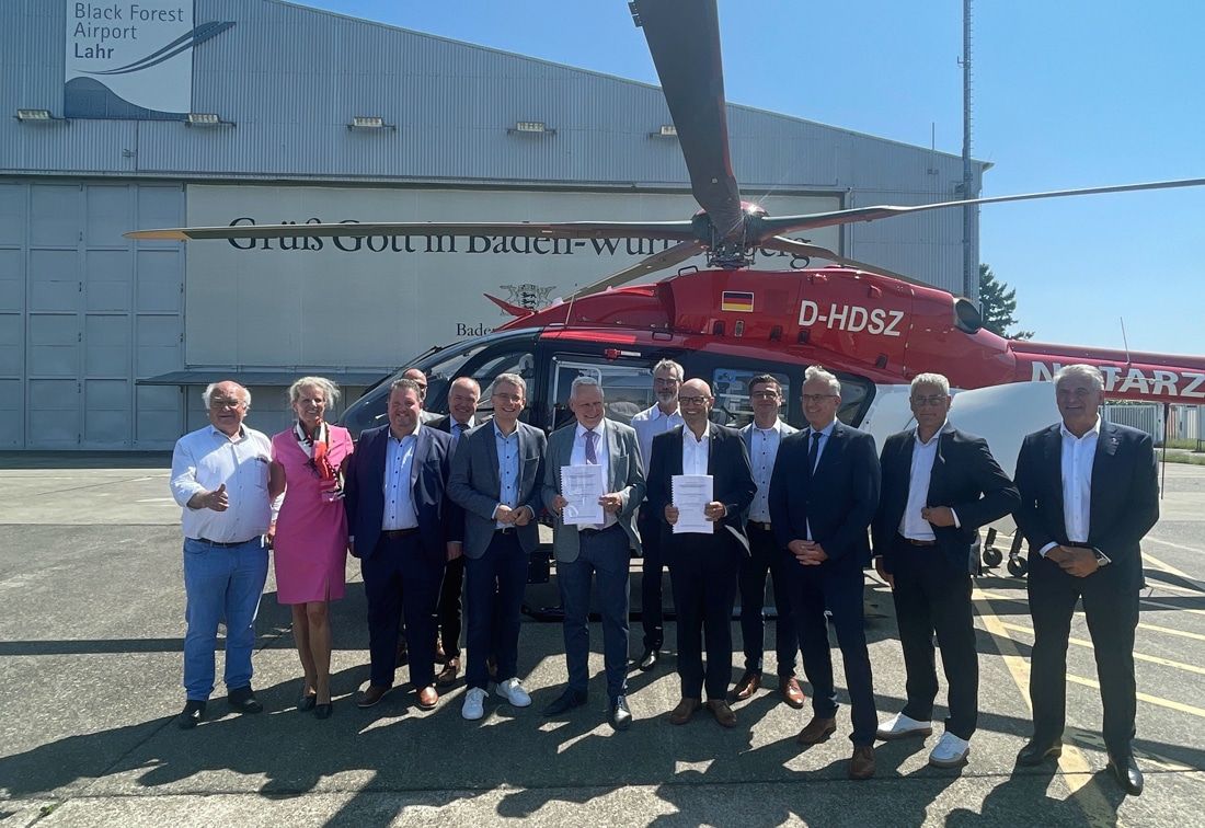 Landrat Thorsten Erny (5.v.l.), der Medizinische Vorstand des Ortenau Klinikums Dr. Peter Kraemer (3.v.r.) und die Vorstandsvorsitzende des Ortenau Klinikums Claudia Bauer-Rabe (2.v.l.) freuen sich mit Staatssekretär Thomas Blenke und Geschäftsführer der DRF Luftrettung Dr. Krystian Pracz (beide Mitte) und weiteren Beteiligten über die Vertragsunterzeichnung.