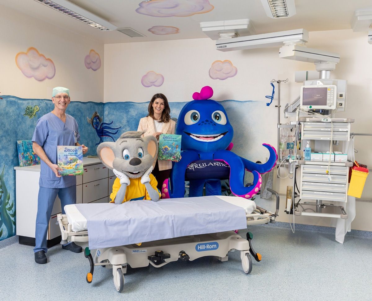 Gemeinsam mit den Maskottchen Snorri und Ed Euromaus besichtigen Prof. Dr. Hartmut Bürkle, Ärztlicher Direktor der Klinik für Anästhesiologie und Intensivmedizin des Universitätsklinikums Freiburg, und Miriam Mack, Soziale und kulturelle Angelegenheiten sowie Head of Corporate Health Mack Gruppe, den neu gestalteten Aufwachraum im Bereich Kinderchirurgie.