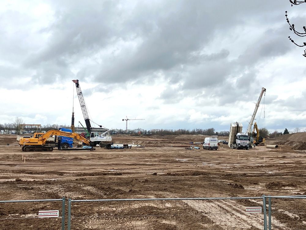 Blick auf das Baugelände mit den laufenden Arbeiten für den Aushub der Baugrube und der Einrichtung der Brunnen.