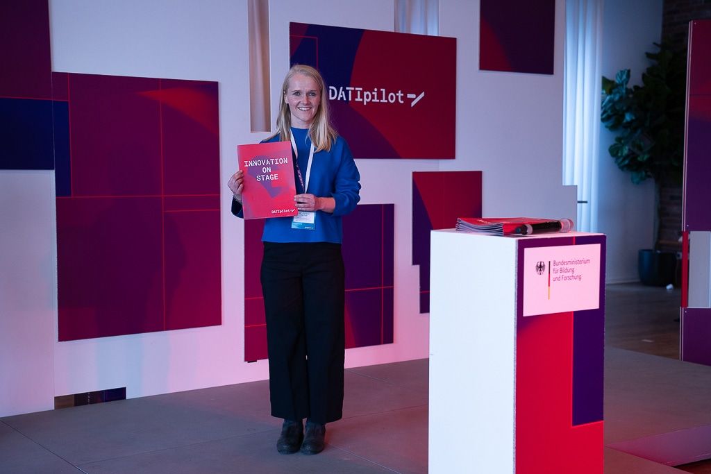 Siegerin des Teilnehmendenvotings Dr. Stefanie Pietsch beim Pitch-Wettbewerb im Rahmen des BMBF-Förderprogramms DATIpilot.