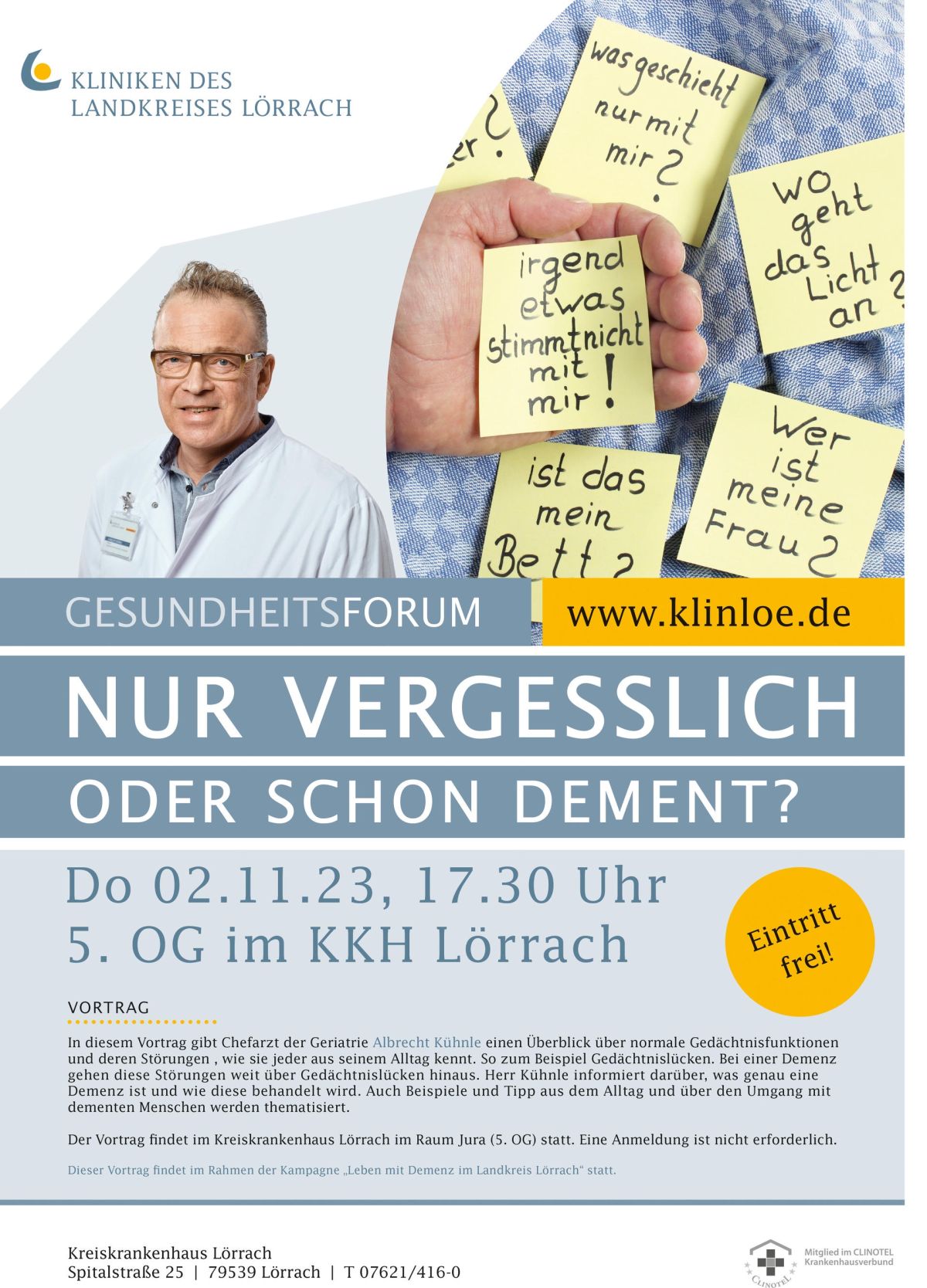 Die Altersmedizinischen Abteilung (Geriatrie) der Kliniken des Landkreises Lörrach veranstaltet am 2. November 2023 um 17:30 Uhr im Kreiskrankenhaus Lörrach (Raum Jura im 5. OG) einen Infoabend. Chefarzt Albrecht Kühnle erklärt zunächst die normale Gedächtnisfunktion und Störungen, wie sie jeder aus seinem Alltag kennt. Der Schwerpunkt des im Rahmen der Kampagne „Leben mit Demenz im Landkreis Lörrach“ stattfindenden Infoabends ist das Thema Demenz. Wie wird eine Demenz festgestellt? Wie wird sie behandelt? Wie ist der Krankheitsverlauf? Beinhaltet sind auch praxisnahe Tipps zum Umgang mit dementen Menschen. Der Eintritt ist frei. Eine Anmeldung ist nicht erforderlich
