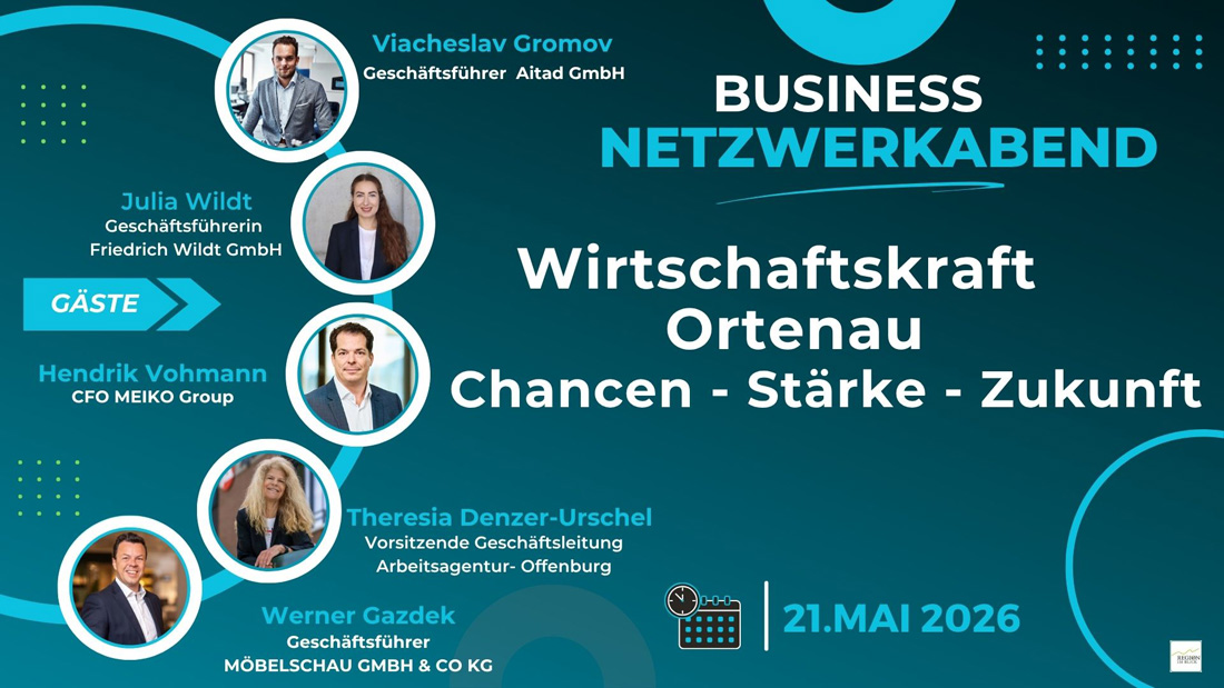 Wie krisenfest ist die Wirtschaft in der Ortenau und welche Chancen liegen gerade jetzt vor uns? Diese Fragen stehen im Mittelpunkt des Netzwerkabends von „Blickpunkt Starkes Netzwerk“ am 21. Mai 2026 bei der Möbelschau in Offenburg.